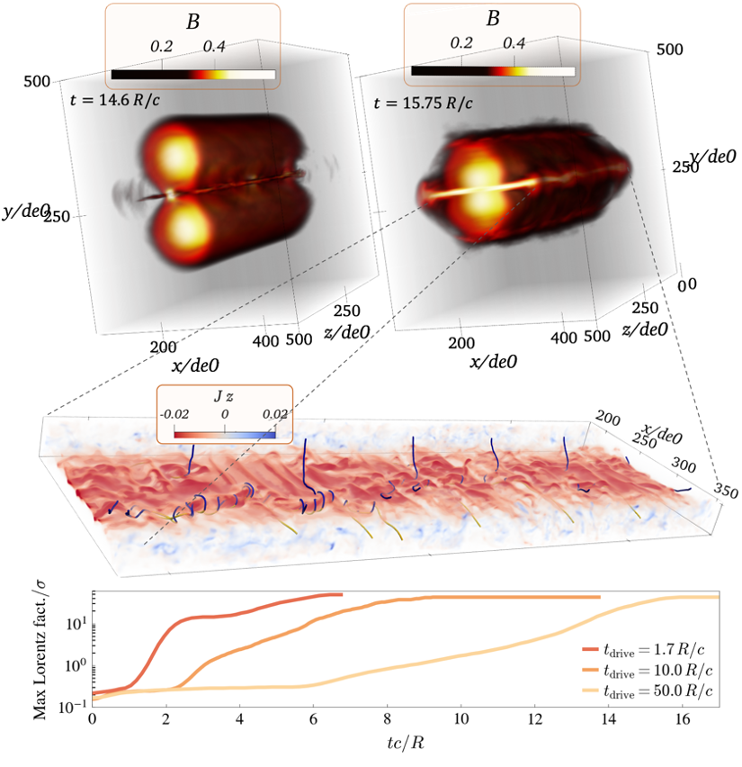 In this work, we study driven collisionless reconnection in merging force-free flux tubes using particle-in-cell simulations of strongly magnetized pair plasmas. The main goal is to understand how reconnection sets in during flux-tube compression, how the nonlinear merging phase develops, and how these dynamics change from 2D to 3D. The 2025 ApJ paper focuses on onset, thinning, and plasmoid formation in 2D, while the 2026 preprint extends the problem to fully 3D kinetic simulations. Driven reconnection in merging flux tubes. The figure summarizes the evolution from current-sheet formation to fast nonlinear merging and particle energization in kinetic simulations of magnetized pair plasmas.These simulations show that the current sheet forms through external driving and thins until reconnection begins. In 2D, plasmoid formation appears once the sheet becomes sufficiently elongated, while the subsequent fast-merging phase becomes largely insensitive to the initial driving speed. In 3D, the same system develops a richer current-sheet structure and patchier reconnection geometry, while preserving the overall picture of delayed onset followed by rapid magnetic-energy release.This work provides a kinetic framework for reconnection-driven energy release in compact-object environments and other strongly magnetized astrophysical plasmas.